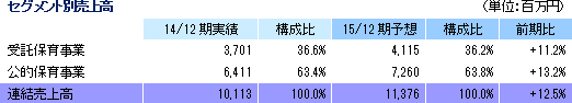 最もニーズが高い認可保育所9施設、学童保育6施設、及び受託保育13施設程度(相手先の都合で変動する可能性がある)の新規開設を予定しており、施設数の増加で売上高が113億75百万円と前期比12.5%増加する見込み。セグメント別の売上の見通しは、受託保育事業の売上が同11.2%増の41億15百万円、公的保育事業の売上が同13.2%増の72億60百万円。新規開園に伴う建築関連費用や備品類の購入費用、更には保育士等の採用活動費といった開園準備費用が負担となり営業利益が2億33百万円と同36.8%減少するものの、営業外収益に計上する設備補助金収入の寄与で経常利益は同3.5%減の6億58百万円を確保できる見込み。 配当は、1株当たり上期末15円、期末15円の年30円を予定している。同社は配当と内部留保充実のバランスを総合的に判断し、業績や設備投資の進捗等を見ながら柔軟に対応していく考え。 ![]() (2)15/12期の取り組み