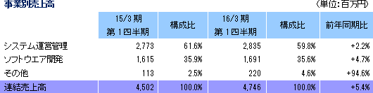売上高は前年期比5.4%増の47億46百万円。情報サービス産業の改善が継続する中、既存顧客へのグループ横断的な営業展開を積極的に行ったことなどから、システム運営管理、ソフトウエア開発共に増加した。一方、営業利益は前年期比10.6%減の1億88百万円。売上高の増加要因があったものの、外注費の増加や本社移転にともなう賃料や減価償却費の増加により販管費が増加したことが影響した。グループ経営資源の共有と活用による業務効率化などの成果などにより、売上総利益率は、19.6%と前年同期比0.8ポイント向上、売上高対販管費比率は、15.7%と前年同期比1.6ポイント上昇した。経常利益は、為替差益の発生(5百万円)はあったが同6.7%の減少、親会社株主に帰属する四半期純利益は、投資有価証券売却益の計上(33百万円)などにより、同0.2%増加した。本社移転にともなう費用発生を含め当第1四半期の業績は概ね予定通りの着地となった模様。 ![]() ソフトウエア開発事業の売上高は前年同期比4.7%増の16億91百万円。公共系の案件が制度改正、法改正対応等によって好調に推移した他、システム統合や更改対応により、金融系の案件が堅調に推移した。 その他事業の売上高は前年同期比94.6%増の2億20百万円。セキュリティ販売やコンサルティングの売上が増加した。 ![]() ![]() (3)トピックス