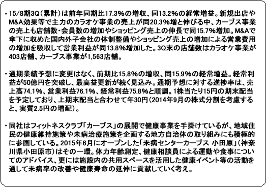 事業は、「カラオケ本舗まねきねこ」やひとりカラオケ専門店「ワンカラ」を運営するカラオケ事業、“女性専用30分健康体操教室”として中高年齢層をターゲットに女性専用フィットネスクラブ「Curves(カーブス)」を展開するカーブス事業、新規事業として育成中の温浴事業(各種温浴設備を備えた施設の運営。「居抜き出店方式」のノウハウを活用し店舗展開)、及び不動産管理事業に分かれる。14/8期の売上構成比は、カラオケ事業54.9%、カーブス事業40.8%、温浴事業3.6%、不動産管理事業0.7%。利益構成比は、カラオケ事業33.2%、カーブス事業69.1%、温浴事業 △5.0%、不動産管理事業2.7%。