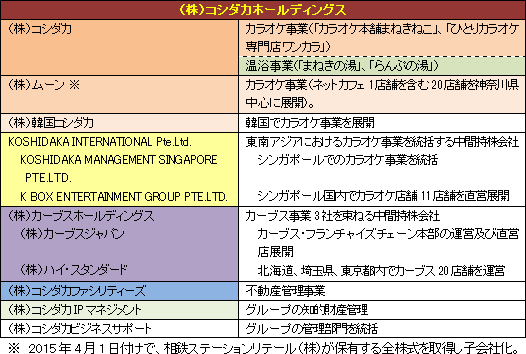 1954年に都内で飲食店として創業し、64年に現在本社のある群馬県前橋市に移転。67年に(有)新盛軒として法人組織に改組した。会社が大きく変わり始めたのは、現在、社長を務める腰髙博氏に実質的な経営権が委ねられてから。博氏のリーダーシップの下、90年にカラオケボックス事業に参入。レーザーディスクを使ったスナックやバー等でのカラオケから通信システムを活用したカラオケボックスへ需要がシフトする流れをつかみ事業を軌道に乗せた。95年8月の腰髙博氏の社長就任以降は、不況等で廃業するカラオケボックスを利用する出店モデル(居抜き出店)を開発し業容を拡大。2000年3月に(株)コシダカに組織及び名称を変更した。06年3月には(株)カーブスジャパンのフランチャイジーとしてフィットネス事業に進出。07年6月のJASDAQ上場を経た08年10月には(株)カーブスジャパンを子会社化(実質持株比率90%)し、現在、グループでFC(フランチャイズチェーン)本部の運営とフィットネスクラブの直営店展開を行っている。 10年9月には純粋持ち株会社へ移行し、(株)コシダカホールディングスに組織及び名称を変更。海外展開も進め、11年6月に韓国ソウルにカラオケ本舗まねきねこ海外1号店を開設。13年11月に中間持株会社(東南アジアにおけるカラオケ事業の統括会社)KOSHIDAKA INTERNATIONAL Pte.Ltd.を設立。その傘下でシンガポールでのカラオケ事業を統括するKOSHIDAKA MANAGEMENT SINGAPORE PTE.LTD.が、14年2月にシンガポール国内でカラオケ店舗11店舗を直営展開しているK BOX ENTERTAINMENT GROUP PTE.LTD. を子会社化した。14年7月に本社機能を東京に移転。15年4月には、カラオケやネットカフェ20店舗を、神奈川県を中心に展開する(株)ムーンを子会社化した。 【事業セグメントとグループ】