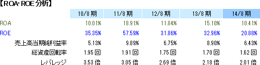 *ROE(自己資本利益率)は、「売上高当期純利益率(当期純利益÷売上高)」、「総資産回転率(売上高÷総資産)」、「レバレッジ(総資産÷自己資本、自己資本比率の逆数)」の3要素を掛け合わせたものとなる。 *上記は決算短信及び有価証券報告書のデータを基に算出しているが、算出に際して必要となる総資産及び自己資本は期中平残(前期末残高と当期末残高の平均)を用いている(決算短信及び有価証券報告書に記載されている自己資本比率は期末残高で算出されているため、その逆数と上記のレバレッジは必ずしも一致しない)。 自己資本の効率性を表すROEも同様に高水準を維持している。過去5年間のROEは11/8期に大きく上振れした後に低下しているが、その要因は、特別利益の計上による一時的な売上高当期純利益率の変動、先行投資、及び好調な業績を反映した急ピッチの財務体質改善である。 |