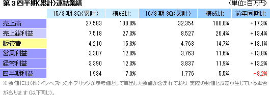 ![]() 前年同期比17.3%の増収、同13.2%の経常増益