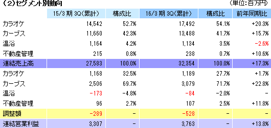 売上高174億92百万円(前年同期比20.3%増)、セグメント利益11億89百万円(前年同期比1.7%増)。「カラオケ本舗まねきねこ」を中心に首都圏での出店を強化しており、この一環として、2015年4月1日に神奈川県を中心にカラオケチェーンを展開する(株)ムーンの全株式を相鉄グループから譲受した。新規出店や(株)ムーンの子会社化効果に加え、14年2月に子会社化したK BOX(シンガポール国内でカラオケ店舗10店舗を直営展開)の期初からの寄与もあり、売上が大きく伸びた。K BOXや(株)ムーンの体制整備等による営業費用の増加を吸収して営業利益が増加した。第3四半期末の国内店舗数は前年同期末(334店舗)に比べて69店舗増の403店舗。前期末との比較では37店舗増加しており、23店舗(22店舗)の新規出店に加え、(株)ムーンの子会社化に伴い21店舗を取得する一方、7店舗(同8店舗)を閉店。この他、26店舗(同28店舗)でリニューアルを実施した。海外店舗数は、シンガポール10店舗、韓国6店舗の計16店舗(前年同期末はシンガポール11店舗、韓国4店舗の計15店舗)。 カーブス事業