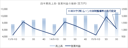 売上高は前年同期比17.3%増の323億54百万円。不採算店舗を閉店した影響で温浴事業の売上が減少したものの、新規出店やM&A効果等で主力のカラオケ事業の売上が174億92百万円と同20.3%増加。カーブス事業の売上も、店舗数・会員数の増加に加え、ショッピング売上(主に会員向けプロテイン販売)の増加で134億88百万円と同15.7%増加した。利益面では、シンガポールでカラオケ事業を手掛けるK BOX ENTERTAINMENT GROUP PTE.LTD.(以下、K BOX)や2015年4月に子会社化した(株)ムーンの体制整備や相対的に原価率の高いショッピング売上の増加で売上総利益率が低下する中、販管費も増加したが、増収効果で吸収して営業利益が37億63百万円と同13.8%増加した。四半期純利益が減少したのは、特別損失(固定資産除却損1億47百万円、減損損失75百万円、店舗閉鎖損失82百万円、計3億35百万円)が増加したため。 ![]() カラオケ事業