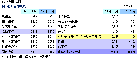 経常利益が50億円を突破する等、最高益更新が続く見込み。通期予想に対する進捗率は、売上高74.1%、営業利益76.1%、経常利益75.8%、と売上・利益共に順調。配当は1株当たり15円の期末配当を予定しており、上期末配当と合わせて年30円となる(14年9月1日の株式分割を考慮すると、実質2.5円の増配)。