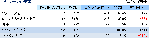 売上高は前年同四半期比0.2%増の13億19百万円。前年同四半期の売上水準が高かった交通情報やライフスタイルの減少でコンテンツサービス事業の売上が同7.1%減少したものの、大型開発案件の順調な進捗と海外での携帯端末販売の好調によるソリューション事業の売上増(同7.4%増)で吸収した。利益面では、ソリューション事業の売上構成比の上昇で売上総利益率が低下したものの(もっとも15/5期第4四半期とほぼ同水準)、広告宣伝費の減少(広告の効率化が進展)による販管費の減少で営業利益が57百万円と同9.1%増加した。ただ、前第1四半期計上の補助金収入が剥落、支払利息や為替差損を計上したため、経常利益は60百万円と同5.6%の増加にとどまった。投資有価証券売却益の減少(3億31百万円→17百万円)で親会社株主に帰属する四半期純利益は24百万円と同88.7%減少した。 ![]() ![]() ![]() ![]() 交通情報