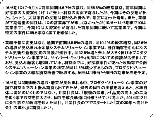 前年同期はクレジットカード会社の統合に伴う好採算の大型案件(1件)が売上・利益の両面で寄与したが、今期はその反動が出た。もっとも、大型案件の反動による減収・減益は当初から織り込んでいたため、想定に沿った着地。また、業績が下期偏重の同社は、第1四半期の営業赤字が珍しくなかったが(10/6期~14/6期まで営業赤字)、今期の第1四半期は前年同期に続いて営業黒字。しかも、前年同期の黒字は、上記の通り、1件の大型案件に依存するものだったが、今期は特定の案件に頼る事なく黒字を確保した。プロダクトソリューション事業の営業損益が黒字転換した事も第1四半期の注目点だ。サイバーセキュリティに対する意識の高まりで自社製・他社製パッケージの売上が増加した事がその要因。同事業の上期は80百万円の営業赤字予想だが、第2四半期も黒字を確保できる見込みで、業績の上振れ要因として注目される。