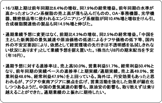 欧州経済の停滞、中国をはじめとする新興国の成長鈍化、更には原油安に伴う合成樹脂原料価格の価格調整等のリスクを織り込んだ結果、慎重な業績予想となった。為替については、1USドル=120円00銭と前期の105円88銭から14円12銭の円安を想定している。配当は1株当たり1円増配の年16円を予定(上期末8円、期末8円)。同社は将来の事業展開及び事業投資と経営基盤・財務基盤の強化のために必要な内部留保を確保しつつ、安定的な配当の継続を実施していくことを基本方針としている。 |