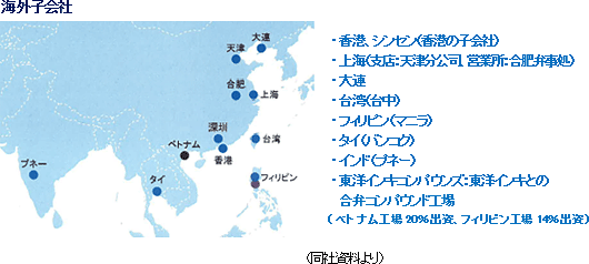 *上記は決算短信及び有価証券報告書のデータを基に算出しているが、算出に際して必要となる総資産及び自己資本は期中平残(前期末残高と当期末残高の平均)を用いている(決算短信及び有価証券報告書に記載されている自己資本比率は期末残高で算出されているため、その逆数と上記のレバレッジは必ずしも一致しない)。 現在、同社が力を入れているのは、中国・アジア地域に進出している顧客である海外進出日系企業のニーズに対応するための海外拠点の充実である。これによって、日系企業の“Made by Japan”の高い品質を、高機能素材の安定供給ときめ細やかなサポート体制で強力にバックアップする事ができれば、売上高当期純利益率の向上につながる。 ![]() |