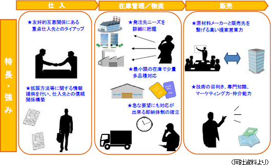 高付加価値商材の拡販の原動力となっているのが、(1)合成樹脂原料に関する高い専門性、(2)商社としてのネットワークを駆使した、メーカーを巻き込んでの提案力、及び(3)顧客との質の高いコミュニケーションが可能とする少量多品種即納体制、の3点。いずれも合成樹脂専門商社に不可欠な要素であり、最もQCDに厳しい日本の優良企業との継続的取引の中で同社が磨き上げてきたコアコンピタンスである。高い専門性を背景にメーカーと一体となって提案営業を進める事でビジネスを広げ、少量多品種の即納対応及び顧客密着型の営業展開で顧客満足度を高めている。