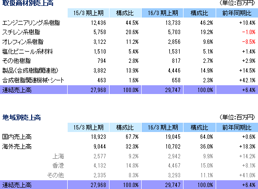 中国、インド、東南アジアを中心とした世界的な人口の増加と生活水準の向上による消費の増加を背景に消費財・耐久消費財の素材であるプラスチックの需要増が続いており、市場は拡大傾向にある。同社はアジアを中心に海外の顧客ニーズを取り込む事で更なる事業拡大を図るべく、重点エリアを中国からアジアへと広げ、拠点整備を進めてきた。アジアでの拠点整備は一巡しており、16/3期以降、アジアの成長を本格的に取り込んでいく考え。