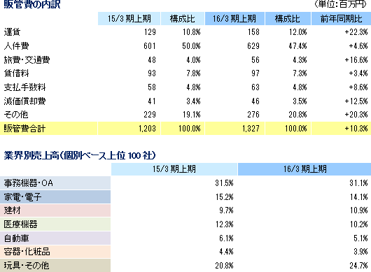 売上高は前年同期比6.4%増の297億47百万円。前年同期の水準が高かったオレフィン系樹脂が落ち込んだものの、OA・事務機器、光学機器(カメラ等)、精密部品(ギア等の機構部品)等に使われるエンジニアリング系樹脂が同10.4%増と伸びた他、合成樹脂関連の製品が高い売上の伸びを示した。地域別売上高は、国内が同0.6%増の190億45百万円(売上構成比64.0%)、円安の追い風もあった海外が同18.3%増の107億02百万円(同36.0%)。海外の内訳は、上海が同14.2%増の29億42百万円(同9.9%)、香港が同8.1%増の44億67百万円(同15.0%)、その他が同41.0%増の32億93百万円(同11.1%)。 営業利益は同9.2%増の4億24百万円。付加価値の高いエンジニアリング系樹脂が増収をけん引する中、製品販売の好調や円安の寄与もあり、売上総利益率が5.9%と0.2ポイント改善。売上増による変動費の増加に加え、円安による円ベースでの海外経費増もあり、販管費が13億27百万円と同10.3%増加したものの、売上の増加と売上総利益率の改善で吸収した。実効税率の低下で四半期純利益は2億69百万円と同26.5%増加した。 ![]() ![]() ![]() ![]() |