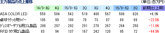 事業は、自動車のスピードメーターや内装照明の光源向けの「ASA COLOR LED」や各種センサ向けのレンズ製品「ASA COLOR LENS」、或いは弱電製品に使われる応用製品、更にはスポーツ用ゴム製品(反発弾性、高摩擦抵抗等を追及した高品質の卓球ラケット用ラバー)等の工業用ゴム事業、点滴輸液バッグ用ゴム栓や真空採血管用ゴム栓、プレフィルドシリンジ(薬液充填済み注射器)向けガスケット等、使い捨てのディスポーザブル用ゴム製品の医療・衛生用ゴム事業に分かれ、15/3期の売上構成比は、それぞれ80.8%、19.2%。 今後は、RFIDタグ向け新製品、マイクロTAS製品などの新製品の販売拡大が期待される。 ・ASA COLOR LED