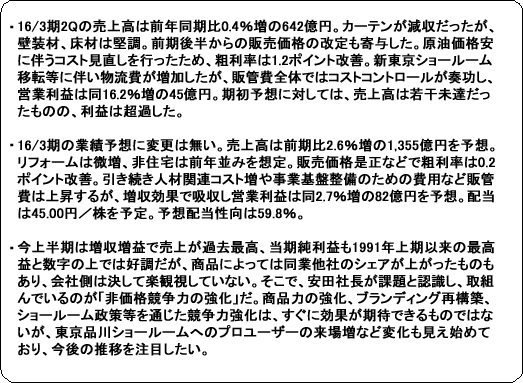 売上高は前年同期比0.4%増の642億円。上期の過去最高を記録した。カーテンが減収だったが、壁装材、床材は堅調だった。前期後半からの販売価格の改定も寄与した。今年6月から原油価格安に伴うコスト見直しを仕入先と行ったため、粗利率は1.2ポイント改善し、粗利も同4.8%増加した。路線便発送個数の増加や東京ショールーム移転に伴い物流費が増加したが、販管費全体ではコストコントロールが奏功し、営業利益は同16.2%増の45億円となった。期初予想に対しては、売上高は若干未達だったものの、利益は超過した。