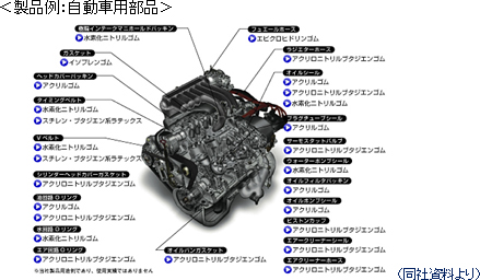 今後はSBRの特性を更に改良した低燃費タイヤ用のS-SBRの需要が急速に拡大すると見込んでおり、これに対応した供給能力増のため、シンガポール工場が2013年9月に稼働を開始。これによって供給能力は、現状の年間5.5万トンから第一期2013年9月にプラス3~4万トン、第二期2016年前半にさらにプラス3~4万トンと二段階で増強されることになる。 ![]() 世界No.1の特殊合成ゴムメーカーである同社はその品質の高さを評価されており、自動車用特殊合成ゴムの中で高いシェアを有している。中でも、タイミングベルト用の水素化ニトリルゴムZetpol®は耐熱性、耐油性、機械的強度特性に優れており、世界シェア約70%を占めている。 また従来品の性能を大きく向上させたZetpol®の新製品を開発した。 これは従来製品比で+15℃も耐熱性を改善させたもので、従来のシール・ガスケット部品の長寿命化に対応できるだけでなく、次世代バイオ燃料を用いたエンジン向けにも需要が拡大すると見込んでいる。さらに、押出加工性が良好であることからホース用途にも展開が広がってきた。顧客の評価も上々で、高価なゴムの代替材を中心として、国内、アジア、欧米で採用が進んでいる。 このZetpol®の新製品は、2012年11月に川崎工場で商業運転が始まり、2013年度より本格稼働を開始した。 ②合成ラテックス事業