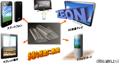 GPI法によってC5留分から抽出、合成されたシクロオレフィンポリマーは、独自技術で開発した熱可塑性プラスチックで、製品としてZEONEX® とZEONOR®がある。ZEZEONEX®は優れた光学特性を活かして、携帯電話に搭載されているカメラの小型レンズのほかプリンター、光ピックアップ、ミラーといった光学部品に使用されている。 ZEONOR®は高透明性や転写性、耐熱性等を活かし、透明汎用エンプラとして、導光板や自動車部品、容器、ディスクなどの幅広い分野で使用されている。 シクロオレフィンポリマーから、世界初の溶融押出製法で開発された光学フィルムがゼオノアフィルム®で、液晶テレビやスマートフォン、タブレット端末のディスプレイに使用されているほか、今後はデジタルサイネージなど幅広い用途での利用が期待されている。 ![]() 従来の3Dテレビは画面に対し両目が水平な状態であれば立体画像が認識できるが、水平でないと画面が暗く見えたり立体画像が不鮮明であった。これに対し、このフィルムは3DTVの視野角を大きく広げることにより、斜めから見た場合でも鮮明に立体画像が認識できる。 有機ELの光反射防止フィルムとしての採用も進んでおり、今後も中小型用フラットパネルディスプレイ向けの需要拡大が見込まれることから、高岡および氷見の2工場(合計 年間生産 1,500万m2)に加えて、福井県敦賀市に新工場が2013年10月に完成した。 他にも、携帯電話、スマートフォン、液晶テレビ用途に代表される、電子デバイス向け塗布型有機絶縁材料ZEOCOAT®がある。 ZEOCOAT®は、透明性が高く、吸水性が非常に低いほか、膜からガス成分を発生しにくいためディスプレイの画質と信頼性の向上を同時に達成することができる。 今後、液晶に比べ薄く成型できる有機ELディスプレイ向けに拡販を積極的に進めるとともに、新しい半導体を用いた薄膜トランジスタやフレキシブルディスプレイ用の絶縁材料での採用を目指している。 ②エナジー用部材