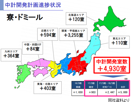 ![]() 1. お客様のニーズに応えるべく、開発投資を集中的かつ積極的に加速 2. 価値と価格のバランス適正化による収益力の強化 を掲げている 開発室数は寮・ドミールで4,930室、ドーミーインが2,794室、リゾートホテルは641室。 寮事業の開発計画 ![]() ![]() |