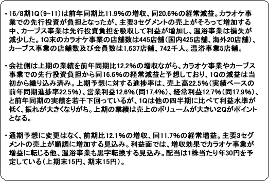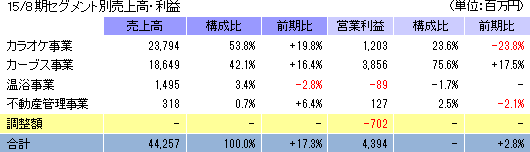 事業は、「カラオケ本舗まねきねこ」やひとりカラオケ専門店「ワンカラ」を運営するカラオケ事業、“女性専用30分健康体操教室”として中高年齢層をターゲットに女性専用フィットネスクラブ「Curves(カーブス)」を展開するカーブス事業、新規事業として育成中の温浴事業(各種温浴設備を備えた施設の運営。「居抜き出店方式」のノウハウを活用し店舗展開)、及び不動産管理事業に分かれる。15/8期の売上構成比は、カラオケ事業53.8%、カーブス事業42.1%、温浴事業3.4%、不動産管理事業0.7%。連結調整利益構成比は、カラオケ事業23.6%、カーブス事業75.6%、温浴事業 △1.8%、不動産管理事業2.5%。 ![]() ![]() 【成長戦略】
