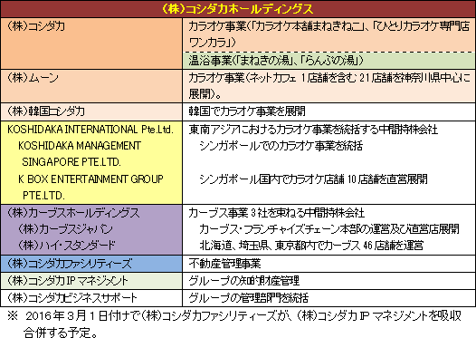 1954年に都内で飲食店として創業し、64年に現在本社のある群馬県前橋市に移転。67年に(有)新盛軒として法人組織に改組した。会社が大きく変わり始めたのは、現在、社長を務める腰髙博氏に実質的な経営権が委ねられてから。博氏のリーダーシップの下、90年にカラオケボックス事業に参入。レーザーディスクを使ったスナックやバー等でのカラオケから通信システムを活用したカラオケボックスへ需要がシフトする流れをつかみ事業を軌道に乗せた。95年8月の腰髙博氏の社長就任以降は、不況等で廃業するカラオケボックスを利用する出店モデル(居抜き出店)を開発し業容を拡大。2000年3月に(株)コシダカに組織及び名称を変更した。 06年3月には(株)カーブスジャパンのフランチャイジーとしてフィットネス事業に進出。07年6月のJASDAQ上場を経た08年10月には(株)カーブスジャパンを子会社化(実質持株比率90%)し、現在、グループでFC(フランチャイズチェーン)本部の運営とフィットネスクラブの直営店展開を行っている。 10年9月には純粋持ち株会社へ移行し、(株)コシダカホールディングスに組織及び名称を変更。海外展開も進め、11年6月に韓国ソウルにカラオケ本舗まねきねこ海外1号店を開設。13年11月に中間持株会社(東南アジアにおけるカラオケ事業の統括会社)KOSHIDAKA INTERNATIONAL Pte.Ltd.を設立。その傘下でシンガポールでのカラオケ事業を統括するKOSHIDAKA MANAGEMENT SINGAPORE PTE.LTD.が、14年2月にシンガポール国内でカラオケ店舗11店舗を直営展開しているK BOX ENTERTAINMENT GROUP PTE.LTD. を子会社化した。14年7月に本社機能を東京に移転。15年4月には、カラオケやネットカフェ20店舗を、神奈川県を中心に展開する(株)ムーンを子会社化した。 【事業セグメントとグループ】
