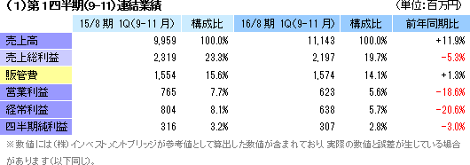 | 2016年8月期第1四半期決算 |