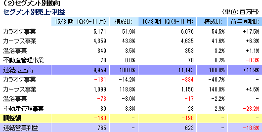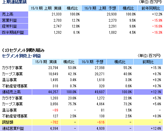 売上高は前年同期比11.9%増の111億43百万円。店舗数の増加や新サービス「ZEROカラ」(後述)の立ち上げでカラオケ事業の売上が同17.5%増加した他、会員数の増加と会員向け物販の増加でカーブス事業の売上も同6.3%増加。温浴事業も同1.1%増加し、3セグメント全てで売上が増加した。ただ、営業利益は6億23百万円と同18.6%減少。カーブス事業の利益が同4.6%増加した他、売上増と固定費削減効果で温浴事業の損失も減少したが、新規出店の増加でカラオケ事業の開店諸費用が増加した。為替差損益の悪化(12百万円→△6百万円)等で経常利益は同20.6%減少したが、固定資産売却益の増加と現存損失・店舗閉鎖損失がなくなった事等による特別損益の改善で最終利益は同3.0%の減少にとどまった。 ![]() カラオケ事業