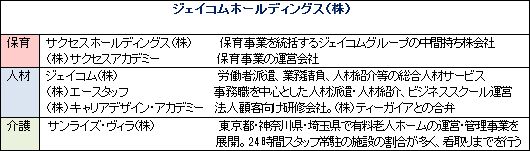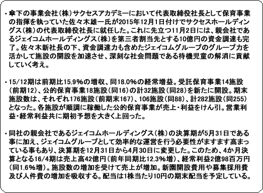 ジェイコムホールディングス(株)が、2015年6月1日から29日にかけてサクセスホールディングス(株)株式の公開買い付けを行い、議決権の50%超を所有するに至った(親会社及び筆頭株主となった)。サクセスホールディングス(株)は連結子会社として、ジェイコムホールディングス(株)との連携を強化する事で、採用力の強化と業務の効率化を図り、事業拡大につなげて行く考え。尚、ジェイコムホールディングス(株)は、人材・保育・介護の事業会社を持つ持株会社。人生のどの段階においても必要とされる企業グループを目指し、保育、人材、介護の3分野で事業を展開している。 ![]() 今後の展開 質の高い保育サービスを提供し、売上・利益共に成長し続ける日本一の保育事業者を目指す