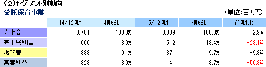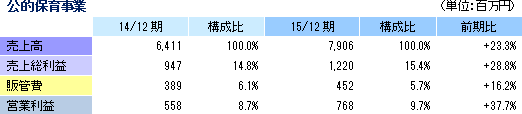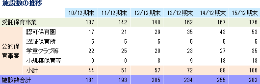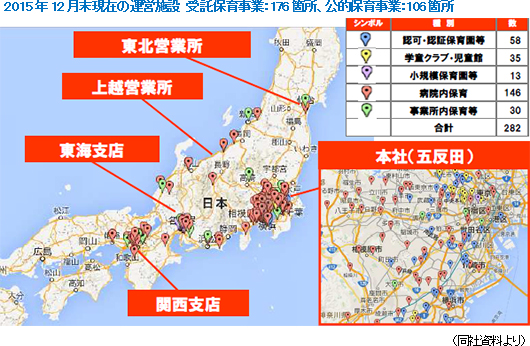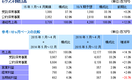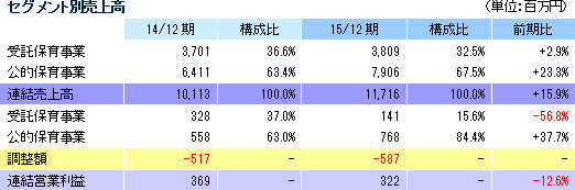 病院・大学・企業等の事業所内保育施設を受託運営する受託保育事業と、「にじいろ保育園」ブランドの認可・認証保育園等(この他、学童クラブ、児童館、全児童対象施設)を運営する公的保育事業を2本柱とし、15/12期の売上構成比は、受託保育事業32.5%(14/12期36.6%)、公的保育事業67.5%(同63.4%)。