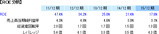![]() *ROE(自己資本利益率)は「売上高当期純利益率(当期純利益÷売上高)」、「総資産回転率(売上高÷総資産)」、「レバレッジ(総資産÷自己資本、自己資本比率の逆数)」の3要素を掛け合わせたものとなる。ROE = 売上高当期純利益率 × 総資産回転率 × レバレッジ