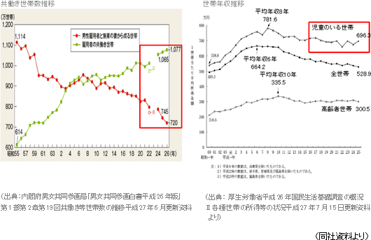 内閣府男女共同参画局「男女共同参画白書 平成26年版」によると、平成に入り「共働き世帯数」が「男性雇用者と無業の妻からなる世帯数」を逆転し、現在は共働き世帯が大幅に増えている。一方、「厚生労働省平成26年国民生活基礎調査の概況」によると、子供のいる世帯の年収は平成8年をピークに低下傾向にある。この結果、子供がいる共働き世帯が増加し、保育所利用児童数も増加傾向にあるが、保育所の整備が追い付いていない。このため、保育所に入れない待機児童の増加が社会問題化している事は周知の通りである。