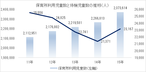 また、厚生労働省「保育所関連状況取りまとめ」〔平成27年4月1日)平成27年9月29日更新版〕によると、待機児童数は、2010年の26,275人をピークに漸減傾向にはあるものの、15年末で23,167人と待機児童問題の解消には程遠い状態。地域別では、東京都、神奈川県が減少したものの、首都圏の待機児童は依然として高い水準にある。