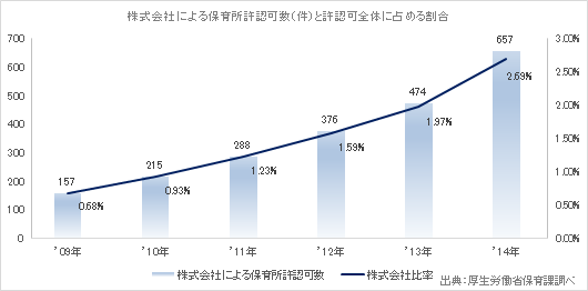 2000年の規制緩和により、株式会社による保育所の開設が認められた。許認可件数ベースで高い伸びを示しているが、2014年4月1日現在、株式会社による保育所認可数は全体の2.69%にとどまる(政令・中核市を除く都道府県21都道府県、政令市10/20市、中核市5/42市)。