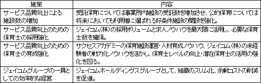 目指すところは、“質の高い保育サービスを提供し、売上・利益共に成長し続ける日本一の保育事業者”であり、この目標達成に向けた施策として、施設数の増加、保育士の採用強化、保育士の育成強化、及びジェイコムホールディングスグループの一員としての効率的な経営の4点を挙げている。