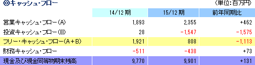 ![]() 貸方では仕入債務、役員退職慰労引当金の減少で負債合計は同5億27百万円減少の52億57百万円となった。利益剰余金の増加等により純資産は同11億91百万円増加した。この結果、自己資本比率は前期末より2.1%上昇し78.0%となった。 ![]() 投資有価証券の取得額が増加し、投資CFはマイナスに転じた結果、フリーCFのプラス幅化縮小した。 財務CFはほぼ変わらず。キャッシュポジションは上昇した。 (4)トピックス