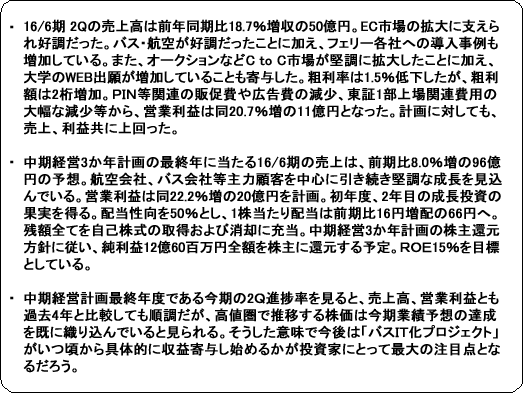 また、コンシューマ向けアプリケーション開発は、今後の同社に欠かせない重要な事業の柱と位置付け、研究開発を進めており、今年夏ごろの開発完了を予定している。 加えて、非対面決済においては請求書のペーパーレス化が今後も進み、電子決済化の流れも加速するものと見込んでおり、こうしたペーパーレス化マーケット拡大に的確に対応できるソリューションの投入に注力する。 また機能拡充、システム安定運用、コストパフォーマンス向上を目指す「カイゼン」に関しては、定常業務のマニュアル化の徹底とトラブルの予兆監視システムによる安定稼働を進めるほか、システムトラブルを極小化するための自動リカバリーシステムの開発を進めている。 また、コストパフォーマンス向上のため原価構成の分析も進めている。 |
