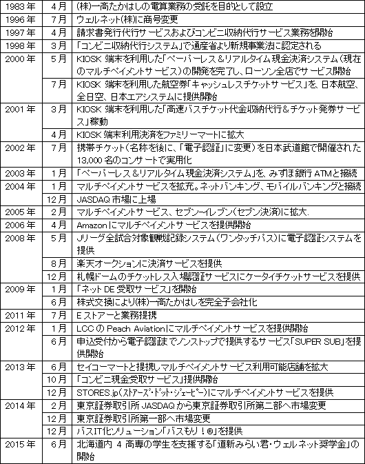 北海道のガス、燃料販売会社の(株)一高たかはしの、新規事業開発をミッションとした子会社として誕生。当時すでにコンビニエンスストアの店頭での公共料金の支払い取り扱いは始まっていたが、これが通信販売に拡大するとの動きを捉えて事業化に着手した。 請求書の印刷・発送から収納情報の処理まで一貫運用する「請求書発行代行サービス」、コンビニエンスストアの店頭で24時間365日支払が可能な「コンビニ収納代行サービス」を開発。販売事業者にとって多額の開発コスト不要なパッケージソフトを無償で配布したことにより、同社システムは急速に普及した。 続いて、紙の請求書を使用せずリアルタイムで電子請求・電子決済を同社1社との接続で実現できる、現在の中心システムを開発。利便性及び様々な収納機関と接続するための開発や契約が不要な点が評価され、航空会社、バス会社等による導入が進み、業績は順調に拡大。2004年JASDAQに上場した。 その後も、Amazon、ヤフーショッピング、楽天オークション、LCC(格安航空会社)といった大手企業への「マルチペイメントサービス」提供が進んでいる他、数多くの実績を誇るケータイチケットサービスの提供等、近年急速に進んでいる電子チケットサービスにも注力している。 ![]() 【市場環境】