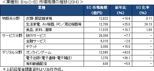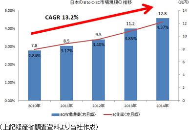 経済産業省の「平成26年度我が国情報経済社会の情報化・サービス化に係る基盤整備(電子商取引に関する市場調査)」(2015年5月29日発表)によれば、日本の消費者向け電子商取引市場(BtoC)の市場規模は2014年で12.8兆円と前年に比べ14.6%の増加となった。2010年から2014年までのCAGR(年平均成長率)は13.2%となっている。