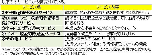 ![]() 同社の受取手数料(売上高)は、初期設定料、月額基本料金、1決済毎の手数料などで構成されている。また手数料は固定制と従量制で構成されているため、事業者の初期投資を低減させている。 ①E-Billing(電子決済)サービス