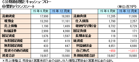 売上高は前年同期比18.7%増収の50億円。EC市場の拡大に支えられ、2桁の増収と好調だった。インバウンド需要等もありバス・航空が好調だったことに加え、フェリー各社への導入事例も増加している。また、オークションなどCtoC市場が堅調に拡大したことに加え、大学のWEB出願が増加していることも寄与した。 一方PINオンライン販売サービス売上は減少が続いている。 粗利額は2桁増加。PIN等関連の販促費や広告費の減少、前期にあった東証1部上場関連費用の減少等に加え、筋肉体質維持のために役員報酬を減額したことなどから、営業利益は同20.7%増の11億円となった。計画に対しても、売上、利益共に上回った。 尚同社ではこれまで、「マルチペイメント」、「オンラインビジネス」、「電子認証」と、サービス別に分類して売上を開示していたが、「決済」をコアとしその周辺サービスの拡充を進めている中、対価を「決済手数料」として得るケースが殆どであり、「決済」と「周辺」の区分けが難しく、サービス別の公表が投資家をミスリードする可能性もあること等から、今期より「決済及びその付随サービス」に変更することとした。 ![]() 一方負債面では、仕入債務の増加などで流動負債が同6億円増加し、負債合計も同6億円増加した。 自己株式が同3億円増加し、純資産は同3億円減少した。 この結果、自己資本比率は前期末の41.6%から2.4%低下し39.2%となった。 (ただし、上記収納代行預り金を資産、負債から控除して計算すると、前期末74.8%、当期末72.7%となる。) ![]() 有価証券の取得による支出額の減少、有価証券の償還による収入額の増加などで投資CFのマイナス幅は縮小。フリーCFのプラス幅は縮小した。自己株式の取得などで財務CFのマイナス幅は拡大した。 キャッシュポジションは低下した。 (4)トピックス