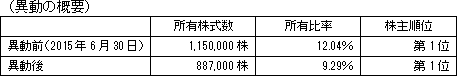 2015年11月2日付で、筆頭株主である株式会社日本政策投資銀行から、保有株式の一部を売却した旨の通知があった。異動後も同銀行が筆頭株主であることに変化は無い。◎主要株主の異動 今後の見通しについて特に記載する事項はない。 ![]() *所有株式数については、異動前は2015年6月30日現在の株主名簿、異動後は2015年11月2日付の株式会社日本政策投資銀行の通知に基づき記載しており、ウェルネットとして確認できたものではない。異動前後の大株主順位についても、ウェルネットが2015年6月30日現在の株主名簿に基づき推定で記載している。