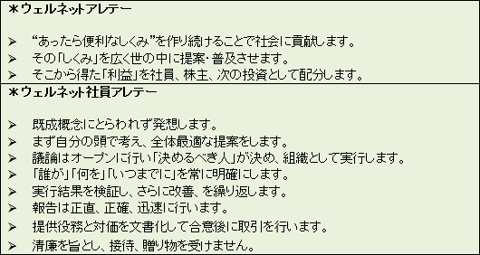 成長戦略の両輪(「事業開発」と「カイゼン」)を強力かつスピーディーに推進するために、これら関連プロジェクトを社長直轄として推進することとしている。また、若手社員の積極的な登用とともに、必要な人材は外部にも求め「想いを共有できる人」を採用し、目標を達成できる体制を整え、目的達成へのモチベーション高揚のためにストックオプションなど諸施策も有効に活用する考えだ。 社員教育にも力を入れており、会社としての存在意義と社員の行動指針を“ウェルネットアレテー”として定め実効性のあるガバナンスを実現しているが、これを改めて徹底させる。 (アレテーとはギリシャ語で、「徳」、「優れた者」、「卓越したもの」を意味する。) ![]() ◎数値目標