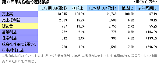 ![]() 前年同期比67.1%の増収、同199.8%の経常増益