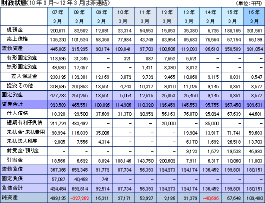 14/3期決算において債務超過状態に陥ったが、2015年3月に(株)フォーバル及び(株)フォーバル・リアルストレートの代表取締役である吉田浩司氏を割当先とする第三者割当増資を実施して債務超過状態を解消した。16/3期末現在、未だ資本の厚みには欠けるものの、筋肉質でスリムな財務状態を実現しており、流動比率156.0%、固定比率8.2%、有利子負債のない無借金経営で自己資本比率36.3%。また、損益及びキャッシュ・フローの面では、営業損益及び営業CFの黒字が定着してきた。 ![]() ![]() |