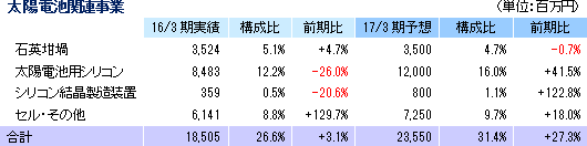 売上高314億05百万円(前期比18.2%増)、営業利益31億48百万円(同106.6%増)。半導体の製造過程で使われる石英製品(同47.5%増の76億24百万円)やセラミックス製品(同18.6%増の61億47百万円)、及び新たに加わったCVD-SiC製品(M&Aにより下期より売上計上:16億85百万円)がスマートフォン用半導体及びフラッシュメモリー等向けに増加した。一方、各種製造装置の機能部品である真空シールは、半導体微細化投資の一巡で71億63百万円と同4.7%減少。シリコンウエーハ加工は自社ブランド品に対する価格要請の強まりや車載用途での価格競争の激化で、売上が43億17百万円と同9.9%減少した。 太陽電池関連事業