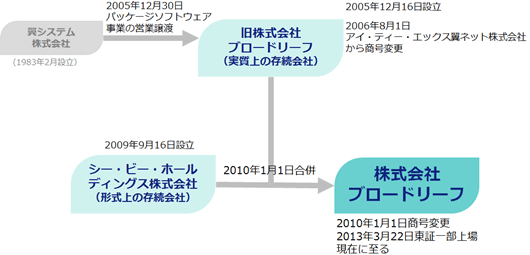 形式上の存続会社である同社は、米国のプライベート・エクイティ・ファンドであるカーライル・グループの支援の下、2009年9月に、実質的な存続会社である「旧株式会社ブロードリーフ」の経営陣によるマネジメント・バイ・アウト(MBO)のための受皿会社として、シー・ビー・ホールディングス株式会社の商号で設立された。その後、シー・ビー・ホールディングス株式会社は同年11月に株式譲渡により旧株式会社ブロードリーフを完全子会社化。2010年1月1日に旧株式会社ブロードリーフを吸収合併することで営業活動を全面的に継承すると同時に、商号を株式会社ブロードリーフに変更し、現在に至っている。 実質上の存続会社である旧株式会社ブロードリーフは、2005年12月、自動車部品商、自動車整備業、自動車鈑金塗装業など自動車アフターマーケット業者向け各種システムを販売していた翼システム株式会社から「パッケージソフトウェア事業」を譲受し、アイ・ティー・エックス株式会社の子会社の1社として事業を行っていた。 その後、2008年のリーマン・ショックを機に、自動車業界の環境激変に対応し、短期的な業績変動にとらわれることなく、持続的な成長基盤の構築や海外展開の推進を行うことを目的にMBOを実施した。 同社の設立から現在に至るまでの沿革を図示すると、下図のようになる。 ![]() 【企業理念】
