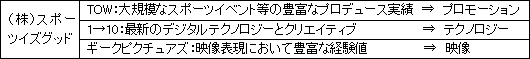 “2020案件”の取り込みに力を入れる。レバレッジを効かせた受注活動を推進するべく、2016年6月1日付けで、(株)ワン・トゥー・テン・ホールディングス(京都市下京区。以下、1→10)及び(株)ギークピクチュアズ(東京都渋谷区)との合弁会社(株)スポーツイズグッドを設立した。異業種3社がタッグを組み、「新たなスポーツ体験」(スポーツの新しい楽しみ方)をプランニング&プロデュースしていく(出資比率は、TOW51%、(株)ワン・トゥー・テン・ホールディングス34%、(株)ギークピクチュアズ15%)。