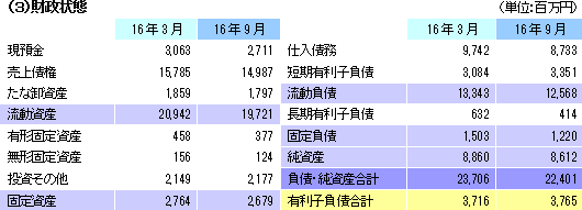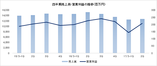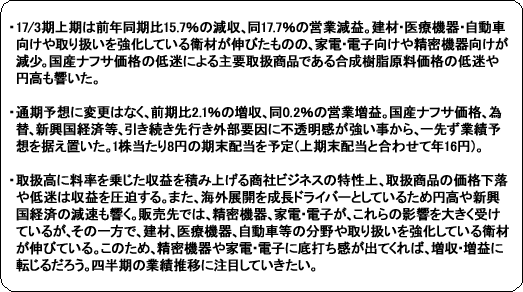 売上高は前年同期比15.7%減の250億89百万円。建材・医療機器・自動車向けや取り扱いを強化している衛材が伸びたものの、光学機器向けを中心に精密機器向けが落ち込んだ他、中国をはじめとする新興国経済の減速で家電・電子向けも減少。国産ナフサ価格の低迷による主要取扱商品である合成樹脂原料価格の低迷や円高の影響も大きかった。利益面では、国内の売上構成比が上昇した事で売上総利益率が改善した他、経費全般の抑制で販管費も減少したが、減収の影響を吸収できず営業利益が3億49百万円と同17.7%減少。為替差損の増加や持分法投資損益の悪化で経常利益は3億円と同25.5%減少した。 ![]() ![]() ![]() ![]() ![]() |