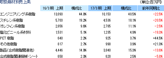 売上高の82.2%がプラスチック原料で(この他、製品15.3%、関連機器・シート2.5%。17/3期・第2四半期実績ベース)、相対的に単価が高く高付加価値商材であるエンジニアリング系(40.5%)やスチレン系(18.1%)の樹脂原料が中心。エンジニアリング系樹脂原料とはポリアミド樹脂、ポリアセタール、ポリカーボネート等で、用途はOA・事務機器、光学機器(カメラ等)、精密部品(ギア等の機構部品)等。一方、スチレン系樹脂原料とは、ポリスチレンやABS樹脂等で、エアコン、冷蔵庫等の白物家電、パソコン・同周辺機器、FAX、及び玩具等で使われている(この他、家電・医療機器向け等のオレフィン系樹脂11.1%、建材向け等の塩化ビニール系材料4.9%、その他樹脂3.9%、PET樹脂3.7%)。販売先業界別の構成比(連結ベース売上高)は、日本メーカーが圧倒的な強みを持つ事務機器・OA・光学機器向けが39.1%、スチレン系・オレフィン系が中心の家電(白物家電)・電子(PC・周辺機器)向けが13.6%、オレフィン系のポリプロピレン等の医療機器向け9.3%、塩化ビニール系材料が中心の建材7.8%、自動車4.4%、ホビー3.8%、パッケージング3.0%、衛材2.8%、その他16.1%。 重点仕入先と仕入商品及び用途