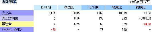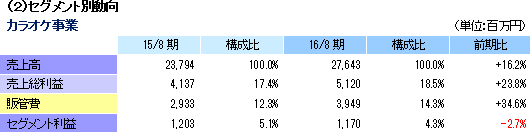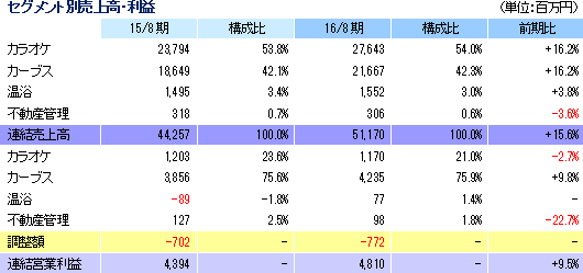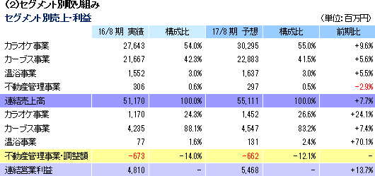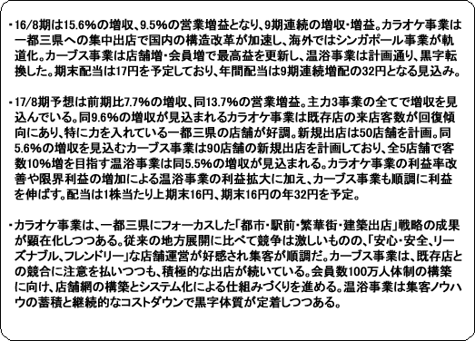 カラオケ事業では、従来の「地方・郊外・居抜き出店」から「都市・駅前・繁華街・建築出店」へ出店戦略を転換して、一都三県にフォーカスした新規出店を進めている。「安心・安全、リーズナブル、フレンドリー」を特徴とする店舗運営が評価されている事に加え、自社開発のカラオケコマンダー「すきっと」を使ったカラオケの新しい楽しみ方の提案や高校生向け「ZEROカラ」等の新サービスの導入等の成果もあり、一都三県の店舗は堅調に推移している。12/8期には21.1%だった一都三県の店舗構成比が16/8期には31.5%に上昇しており、地方経済の不振等による地方店舗の苦戦をカバーできる体制も整ってきた。国内での利益を源泉に海外展開も進めており、足元、国内カラオケ事業で培ったノウハウの移入が進むシンガポール子会社が売上・利益を伸ばしている。16/8期末現在、国内457店舗、海外24店舗を展開。 カーブス事業は、店舗レベルでのコミュニティづくりに独自のノウハウを有し、低い退会率を実現している。30分のエクササイズだが、楽しく続ける事ができるから、時間がかかったとしても、成果を必ず実感できる(エクササイズは続ける事が何よりも大切)。既存店との競合に注意を払いつつ積極出店を続け、店舗数・会員数の増勢を維持している。また、自治体や企業とのコラボレーションにより、未病率の改善や健康寿命の延伸への貢献にも取り組んでいる他、トレーニングとの相乗効果が高いプロテイン等、会員向けの物販にも力を入れている。会員数100万人体制の構築に向け、店舗網の構築とシステム化による仕組み作りを推進中である。16/8期末現在、1,722店舗(内グループ直営店55店舗)を展開し、会員数は772千人。 温浴事業では、東京健康ランドまねきの湯(東京都)、郡山湯処まねきの湯(福島県)、箕郷温泉まねきの湯(群馬県)、大分森温泉まねきの湯、らんぷの湯花園店(共に大分県)の5店舗を運営している。人材育成システムを活用した固定費削減や店舗営業(接客サービス)等、カラオケ事業で培ってきた様々なノウハウの活用と省エネに向けた取り組みで16/8期にセグメント損益を黒字転換させた。当面の目標は営業利益率10%。新コンテンツの導入やキャンペーンの実施で客数10%増を目指すと共に、設備の更新や一段の効率化に取り組んでいる。 |