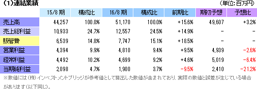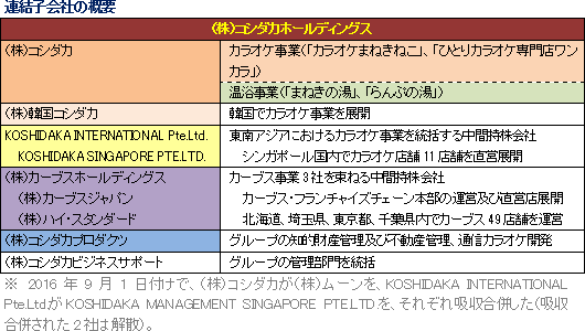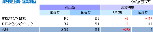 売上高は前期比15.6%増の511億70百万円。一都三県への集中出店で国内の構造改革が加速する中、シンガポール事業が軌道化してきたカラオケ事業の売上が同16.2%増加した他、店舗増・会員増とプロテイン販売の増加でカーブス事業の売上も同16.2%増加。新規出店を行わなかった温浴事業の売上も、集客力の向上で同3.8%増加した。利益面では、カラオケ事業の新規出店の増加とカーブス事業でのプロテイン販売の増加等で売上総利益率が0.2ポイント低下する中、店舗の増加等で販管費も増加したが、増収効果で吸収。営業利益は48億10百万円と同9.5%増加した。ただ、為替差損1億77百万円の計上(前期は30百万円の差益)等で営業外損益が悪化した他、連結納税の対象でない韓国子会社の苦戦等による一時的な税負担率の上昇もあり(45.1%→53.4%)、最終利益は19億円と同9.5%減少した。 期末配当は2円増配の17円を予定しており、年間で32円となる見込み(前期は30円)。 ![]() ![]() 国内店舗の内訳は、まねきねこ426店舗、ワンカラ10店舗、ムーン・シンシア21店舗(前期末、まねきねこ381店舗、ワンカラ10店舗、ムーン・シンシア21店舗)。2016年9月1日付けで(株)コシダカが(株)ムーンを吸収合併したため、現在、(株)ムーンのブランドだった「ムーン」及び「シンシア」の「まねきねこ」化を進めており、11月中には完了する見込み。 売上高が38.5億円増加したが、このうち28億円が新規出店によるもので、10億円が海外の既存店等の寄与によるもの。国内の既存店売上高は前期比100.1%(客数101.1%、客単価99.0%)となり、閉鎖店舗のマイナス分をほぼ吸収した。一都三県への集中出店や2015年9月に開始した高校生向けの「ZEROカラ」(2人以上の高校生グループを対象に、1オーダー制で室料無料)の軌道化で、下期以降、客数が回復傾向にある。また、2016年7月に開始した「朝うた」(昼12時まで室料30分10円)も、狙い通り、シニア層や午前需要の取り込みが進み、順調に立ち上がった。 シンガポールでは従来からの「K-BOXブランド」から「まねきねこ」ブランドへの転換を進めている。期末までに11店舗中6店舗が業態転換を完了し、「まねきねこ」1店舗を新規出店。円高の影響で前期比減収となったものの、オペレーションの効率化等で利益は増加した。一方、韓国は既存店の客数減少を踏まえて、期中に出店計画を修正した(9店舗→4店舗)。従来、飲食ができず歌のみだったが、飲食可能なレイアウトに改造を進めている(規制により、飲食サービスを提供するためには一定以上の飲食スペースが必要)。 利益面では、1号店のオープンから5年が経過したワンカラが通期で黒字化する等の成果があったものの、新規出店や改装に伴い先行的に発生する費用が負担となった。売上の増加(約38.5億円)に対して、人件費(10.1億円増)、減価償却費(8.2億円増)、地代家賃(6.1億円増)を中心に売上原価が30.6億円増加し、開店諸費用(3.6億円増)、のれん償却費(1.0億円増)、広告宣伝費(1.0億円増)等で販管費も8.1億円増加した。 全店統一企画 「ZEROカラ」、「朝うた」