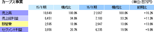 事業は、「まねきねこ」やひとりカラオケ専門店「ワンカラ」を運営するカラオケ事業、“女性専用30分健康体操教室”として中高年齢層をターゲットに女性専用フィットネスクラブ「Curves(カーブス)」を展開するカーブス事業、新規事業として育成中の温浴事業(各種温浴設備を備えた施設の運営)、及び不動産管理事業に分かれる。グループは、持株会社である(株)コシダカホールディングス、及びその傘下で各事業を展開する連結子会社9社と非連結子会社4社。 16/8期の売上構成比は、カラオケ事業54.0%、カーブス事業42.3%、温浴事業3.0%、不動産管理事業0.6%。連結調整利益構成比は、カラオケ事業21.0%、カーブス事業75.9%、温浴事業1.4%、不動産管理事業1.8%。 ![]() ![]() 【成長戦略】